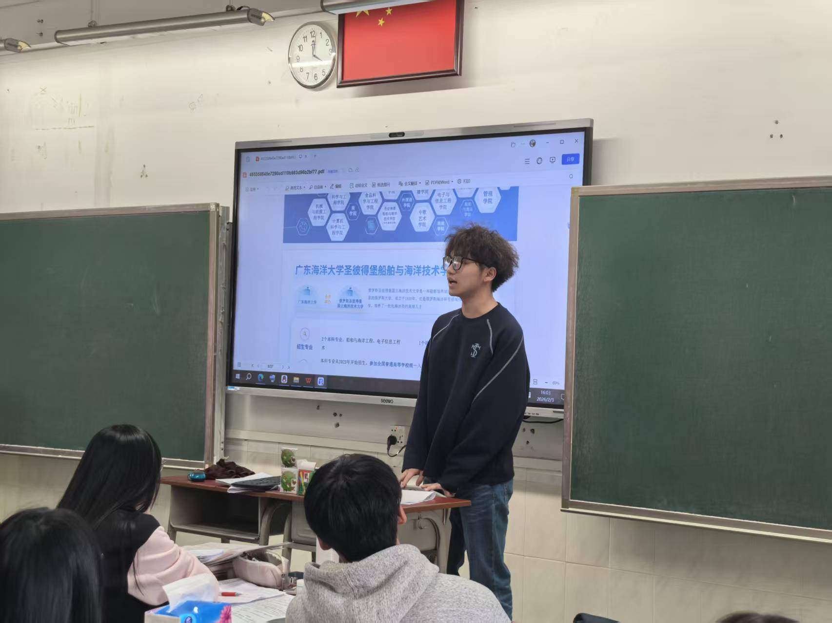 2026年2月3日,beat365体育官网,beat365官方网站寒假招生宣传实践团“来报考就队”赴东莞外国语学校开展招生宣讲与咨询服务。团队由田昀平担任队长,杨苡莘、朱志峰、翁迈、邓铭轩四位不同专业学子共同参与,以“进班精准宣讲+定点咨询服务”形式,用朋辈视角分享学习经历,传递广海办学特色与专业优势。